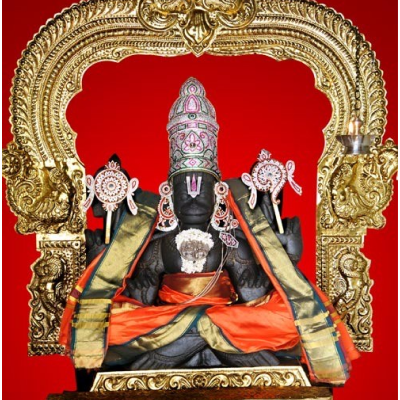 Sri Yoga Anjaneyar is found along with four hands (Chaturbujam) holding Sangu, Chakram, Jaba Mala and with Jaba Muthra in sitting posture (Yoga Pose). He is about 3 feet height sitting on the top of well and facing His ThiruMugam towards North direction. The Utsava Murthy is Sri Bhaktha Anjaneyar. Small Sannadhis for Sri Dhanvantri, Sri Hayagreevar and Sri Narasimhar are found on the walls of the Temple.